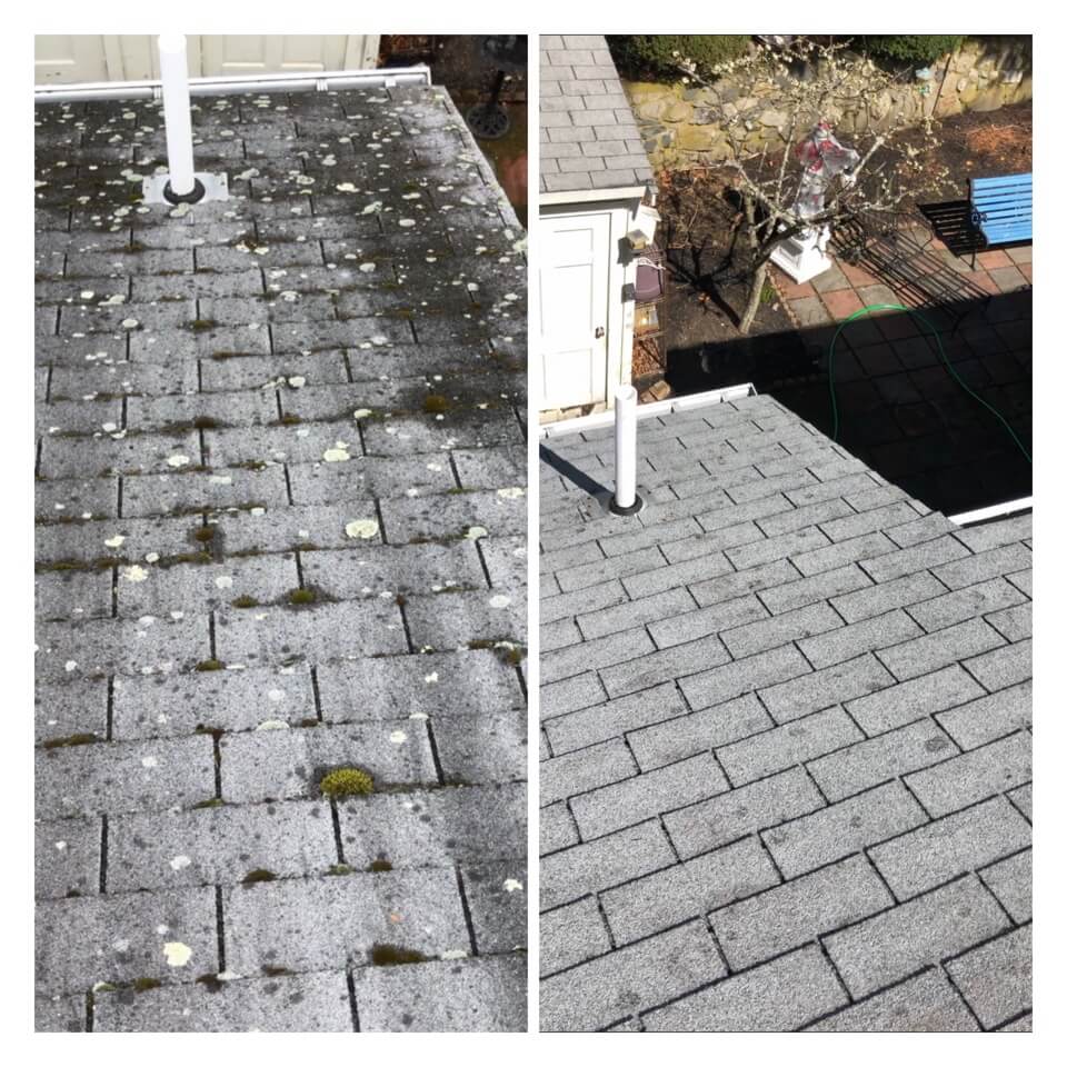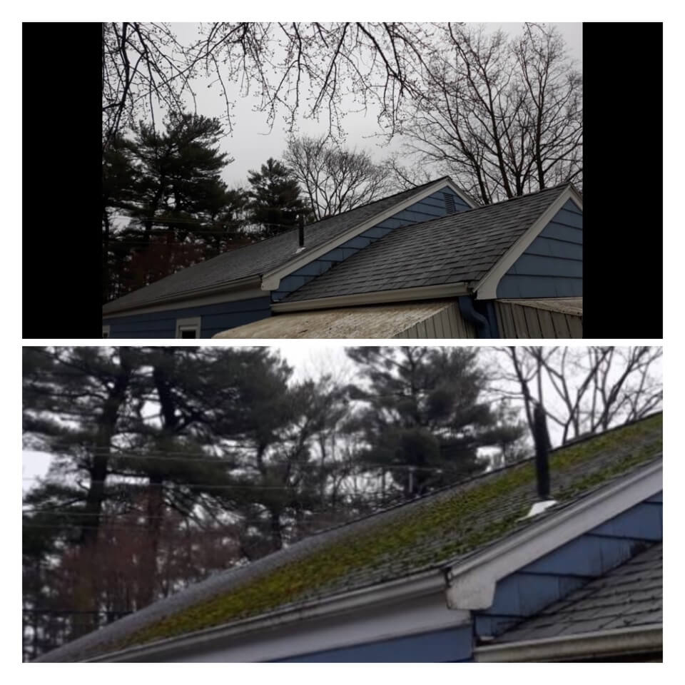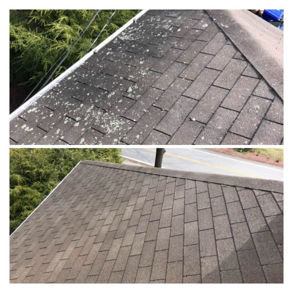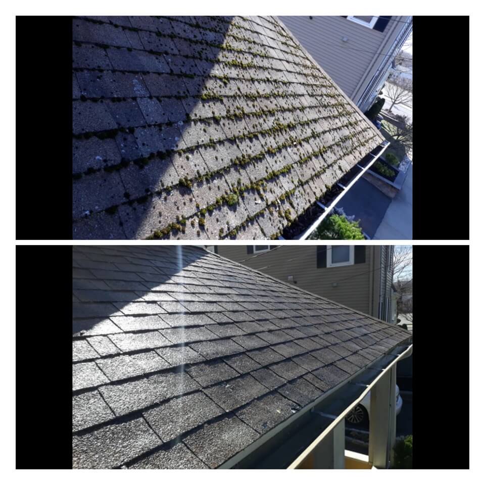 HiCleaners is the most experienced company in Rowley, MA that deals with roof washing and roof soft washing. All of our employees are trained to recognize precise solution mixing ratios to provide you with the safest and most effective soft washing service. Roofs are a commonly neglected part of a house due to the fact that most people don’t have ladders to access it, so it is very easy to just leave it alone and forget about problems that may start to arise. Just like many home owners, discoloration and small bits of moss on a roof can be overlooked because of the misconception that it is just aesthetic. However, it isn’t just aesthetic, the moss slowly lifts the granules off the shingles which in turn shorten the life of the shingle. The moss also spreads, just like any bacteria if it is left alone for too long, it can quickly become a problem that spirals out of control. Call HiCleaners for a free quote, we only use the most advanced eco-friendly solutions and equipment to make sure the job is done right, for the safety of the employees, your plants, grass, pets, and children.